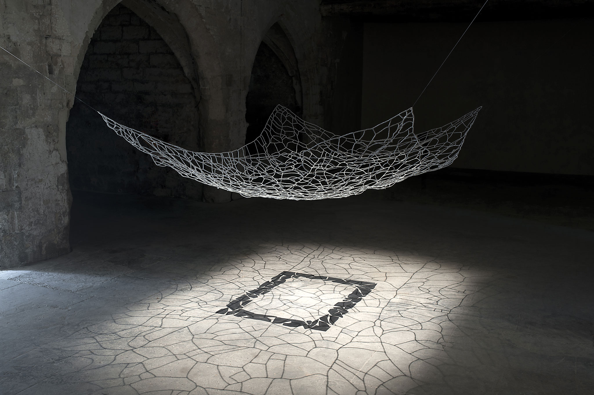 Pour la Biennale Art+, en lien avec la thématique 2024 « De l’air, de l’art », elle imagine à l’orangerie du domaine de Cangé, une installation composée de pièces, dont une réalisée spécialement pour l’exposition, accompagnée d’une vidéo et d’une ambiance sonore. Les œuvres que nous allons découvrir sont façonnées à partir de fils d’aluminium, pour des formes en suspension entre ciel et terre, quand d’autres de manière sérielle se détachent des murs. La lumière les traverse projetant des ombres qui renforcent leur fragilité et l’impression de légèreté.