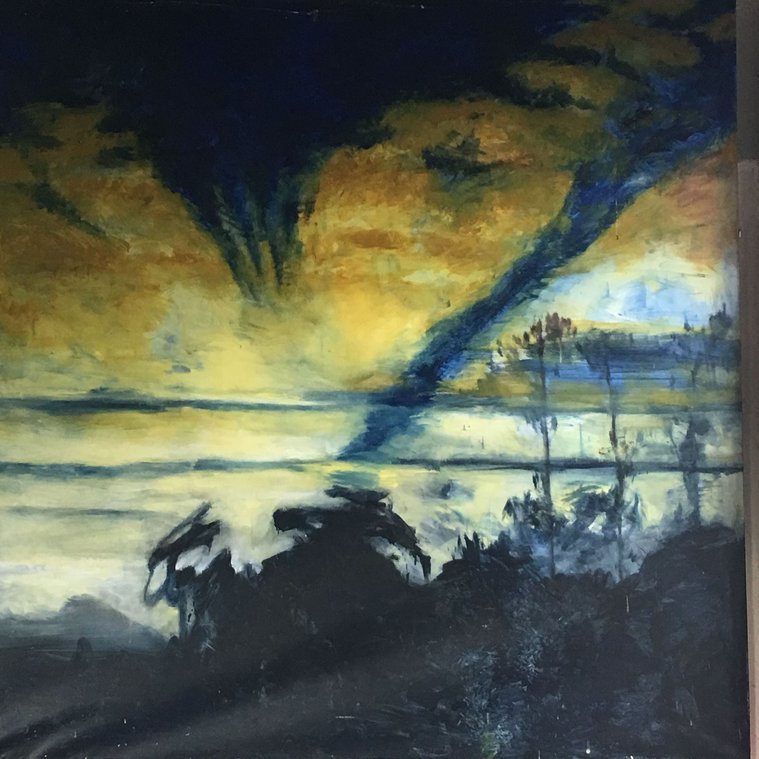 Elle y réalise des séries de toiles de grands formats en peinture à l’huile, inspirées de la nature (paysages en mouvement) et des hommes (et des femmes, du désir et de l’amour), parfois avec un double jeu, une autre lecture de l’œuvre : soit par un jeu de peinture phosphorescente visible en lumière UV (cherchez les lampes torches à disposition), soit par une recherche plastique qui oscille entre abstraction et figuration. Elle cherche, dans le geste et la matière, à transcrire l’expérience humaine dans sa profondeur, à travers ses propres émotions à rejoindre les autres.